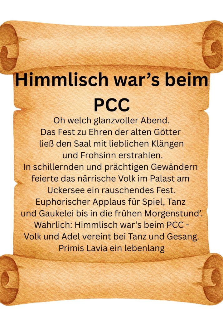 | 22.02.2026 | Großer Närrischer Umzug durch Prenzlau | Beginn 14:00 Uhr Lidl Parkplatz Ende Freilichtbühne Prenzlau mit Programm | begleitet den PCC auf einem ausgelassenen, musikalischen und ganz besonderen Sonntagsspaziergang | für das leibliche Wohl ist gesorgt |